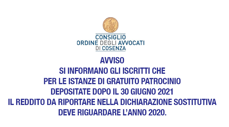 In primo piano News AVVISO 29 giugno 202129 giugno 2021 Ale@2017 605 Views Si informano gli iscritti che per le istanze di gratuito patrocinio depositate dopo il 30 giugno 2021 il reddito da riportare nella dichiarazione sostitutiva deve riguardare l’anno 2020.