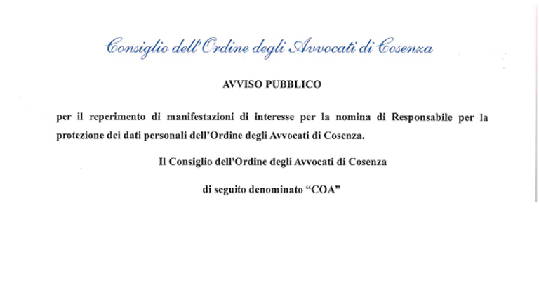 In primo piano News AVVISO PUBBLICO per il reperimento di manifestazioni di interesse per la nomina di Responsabile per la protezione dei dati personali dell’Ordine degli Avvocati di Cosenza 4 novembre 2021 Ale@2017 635 Views Allegato