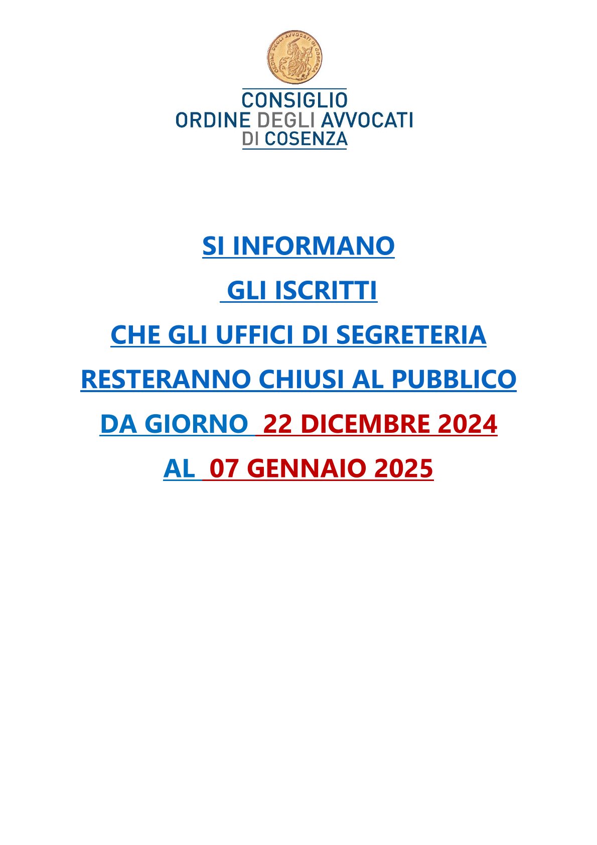 Senza categoria Chiusura uffici di Segreteria Consiglio 18 dicembre 20248 gennaio 2025 Ale@2017 298 Views