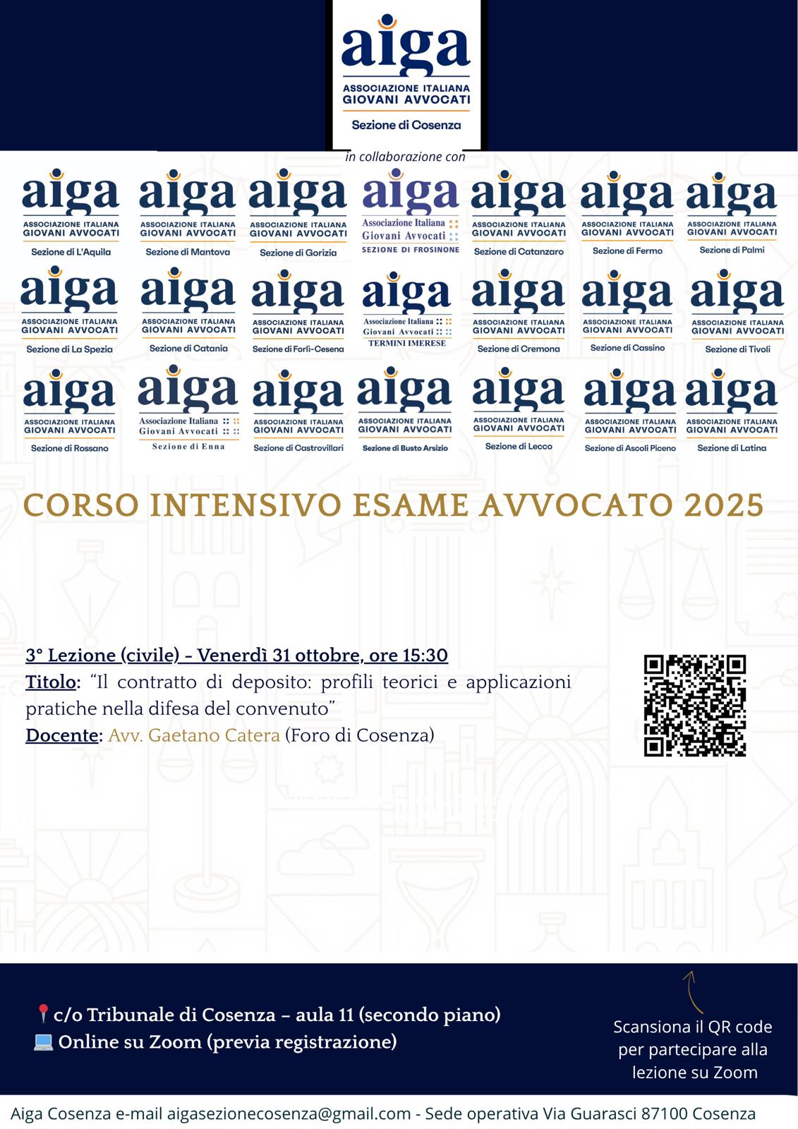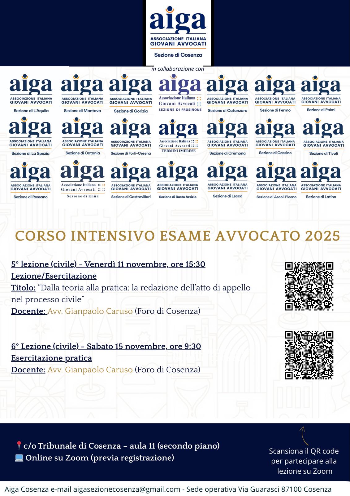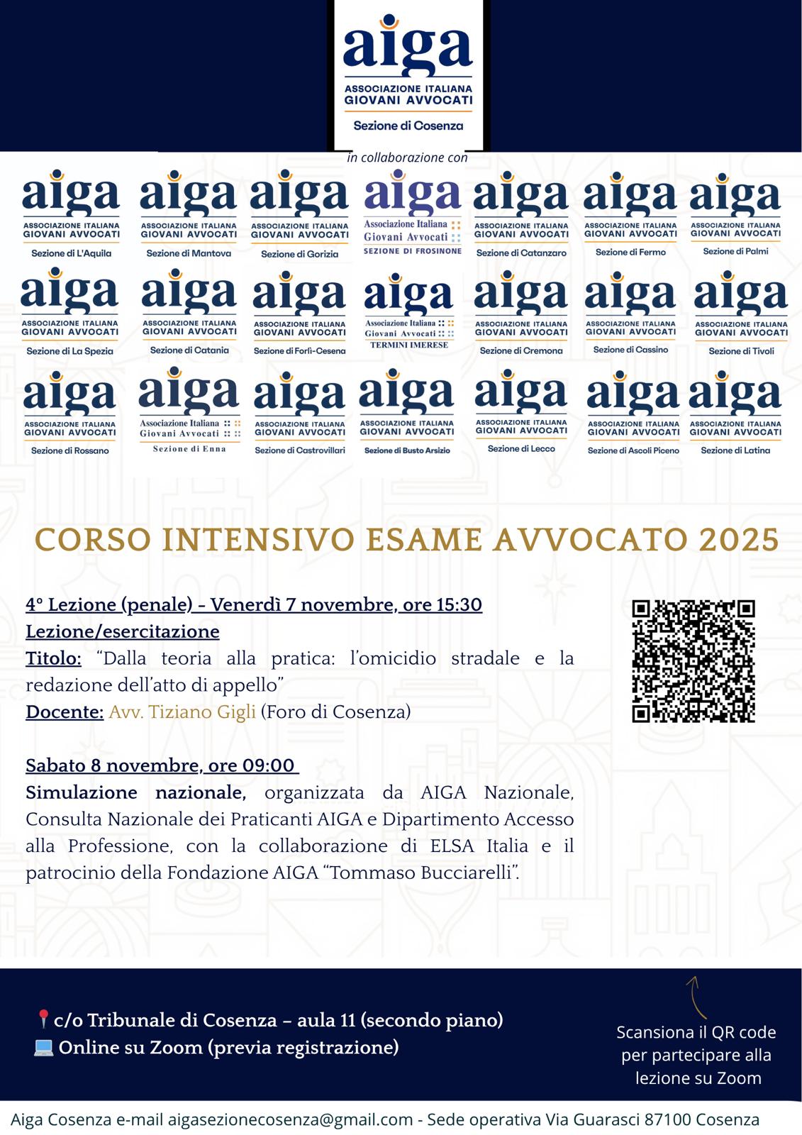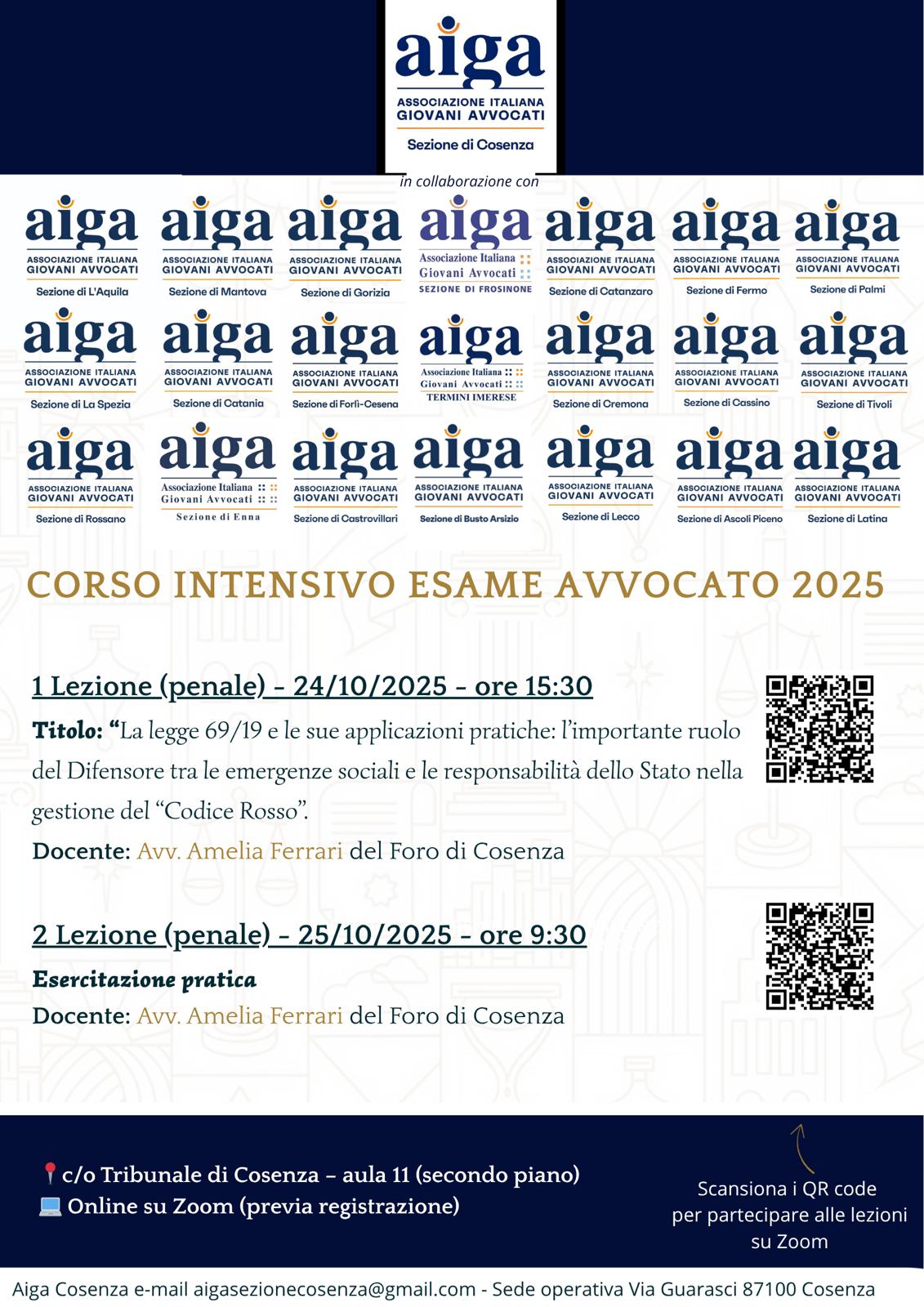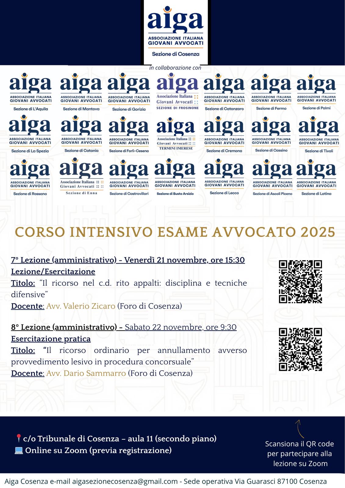 Corsi AIGA CORSO INTENSIVO ESAME AVVOCATO 2025 27 novembre 2025 Ale@2017 225 Views LOCANDINA LEZIONI 21 E 22 NOVEMBRE 2025 LOCANDINA LEZIONI 14 E 15 NOVEMBRE 2025 LOCANDINA LEZIONE 7 NOVEMBRE 2025 LOCANDINA LEZIONE 31 OTTOBRE 2025 LOCANDINA LEZIONI 24-25 OTTOBRE 2025