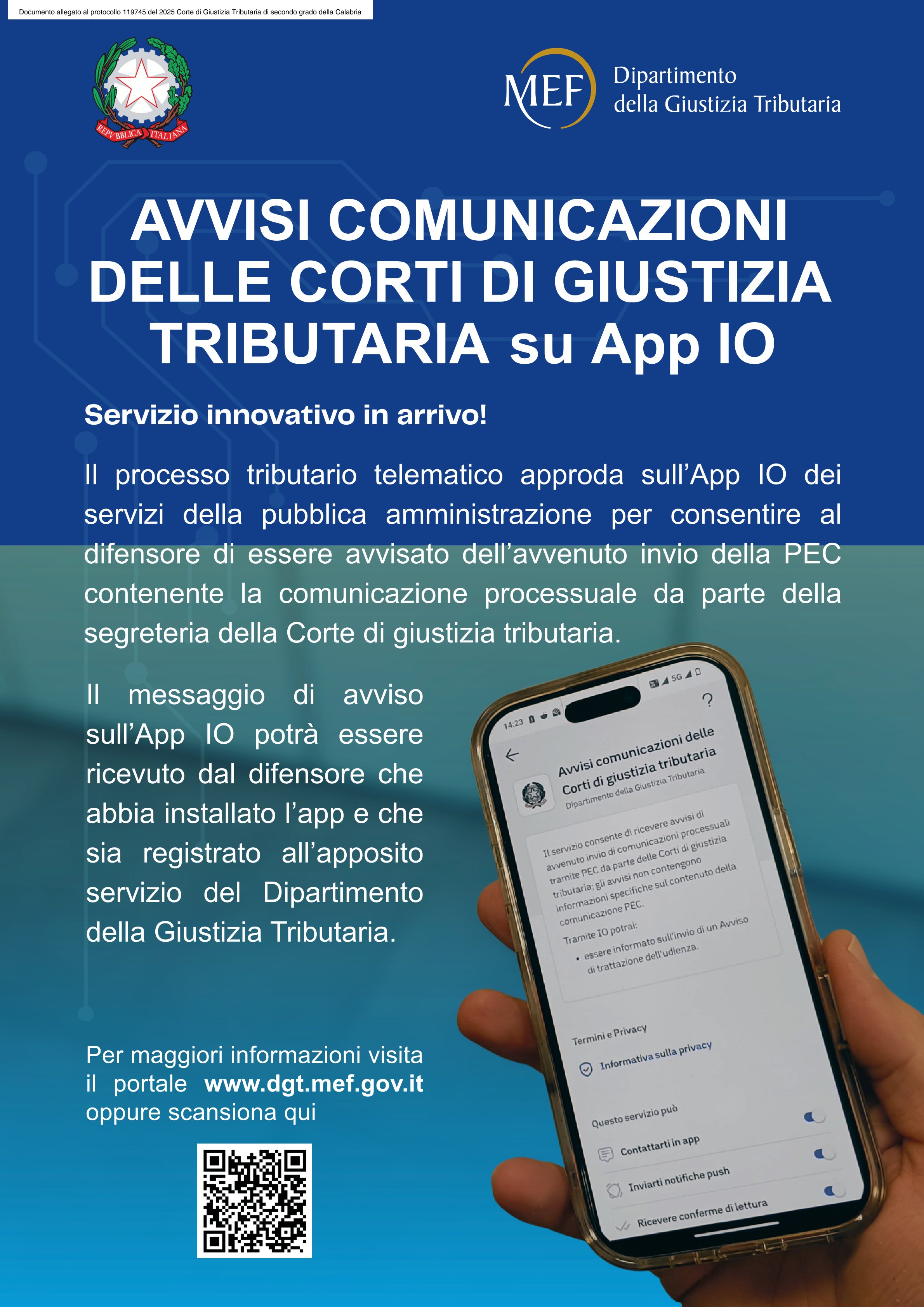 Attivazione sulla App IO del nuovo servizio del Dipartimento della giustizia tributaria denominato “Avvisi comunicazioni delle Corti di giustizia tributaria”.