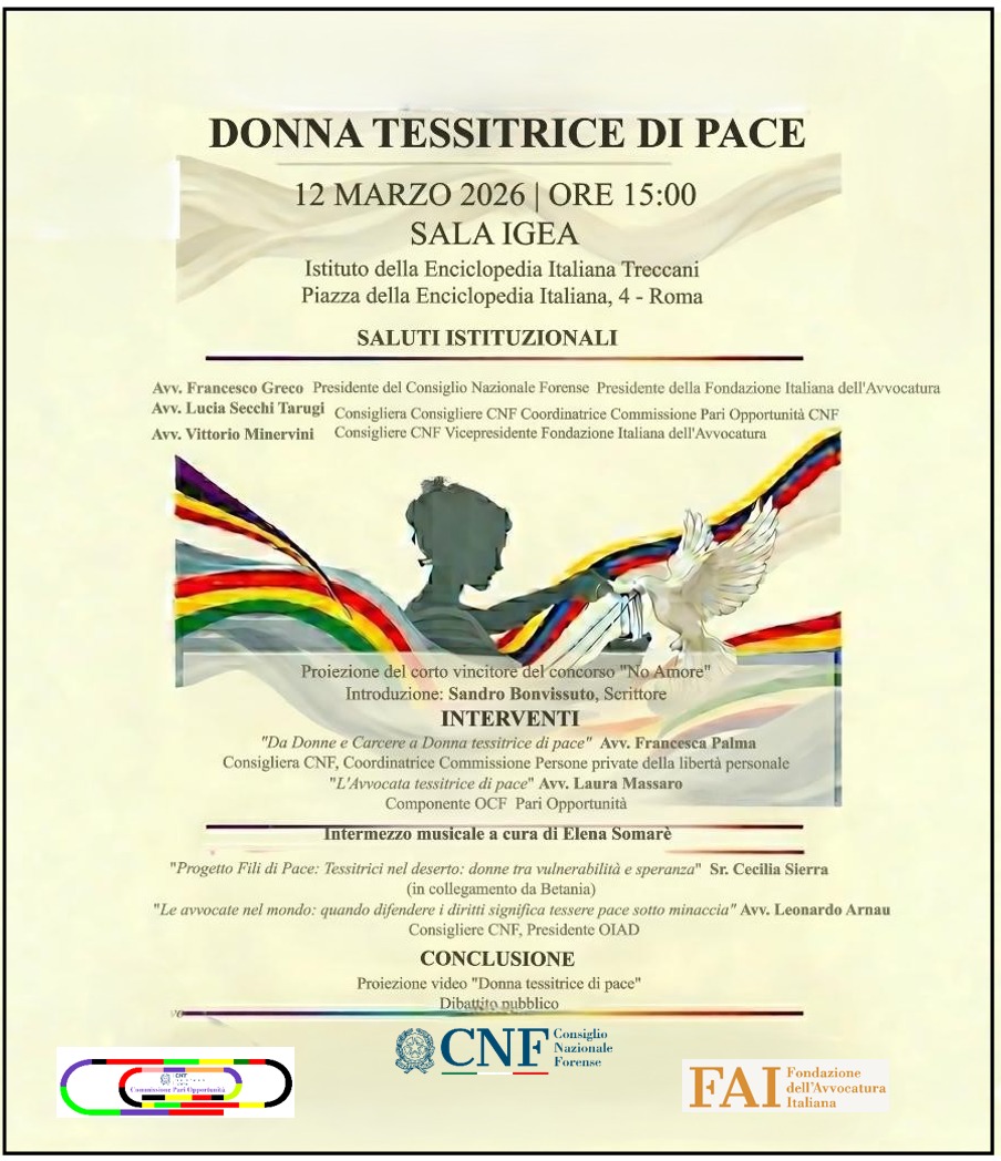 News CONSIGLIO NAZIONALE FORENSE Evento “Donna tessitrice di pace” – Roma, 12 marzo 2026 3 marzo 2026 Ale@2017 94 Views