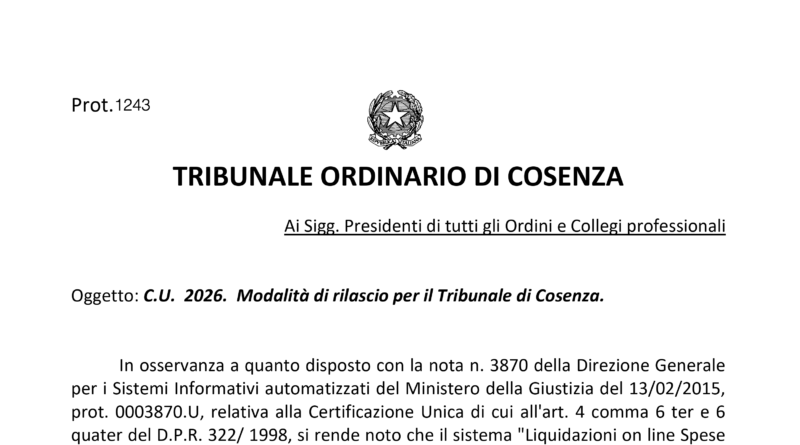 ContinuaDecreto n.27.2026 C.U. 2026 Modalità di rilascio per il Tribunale di Cosenza